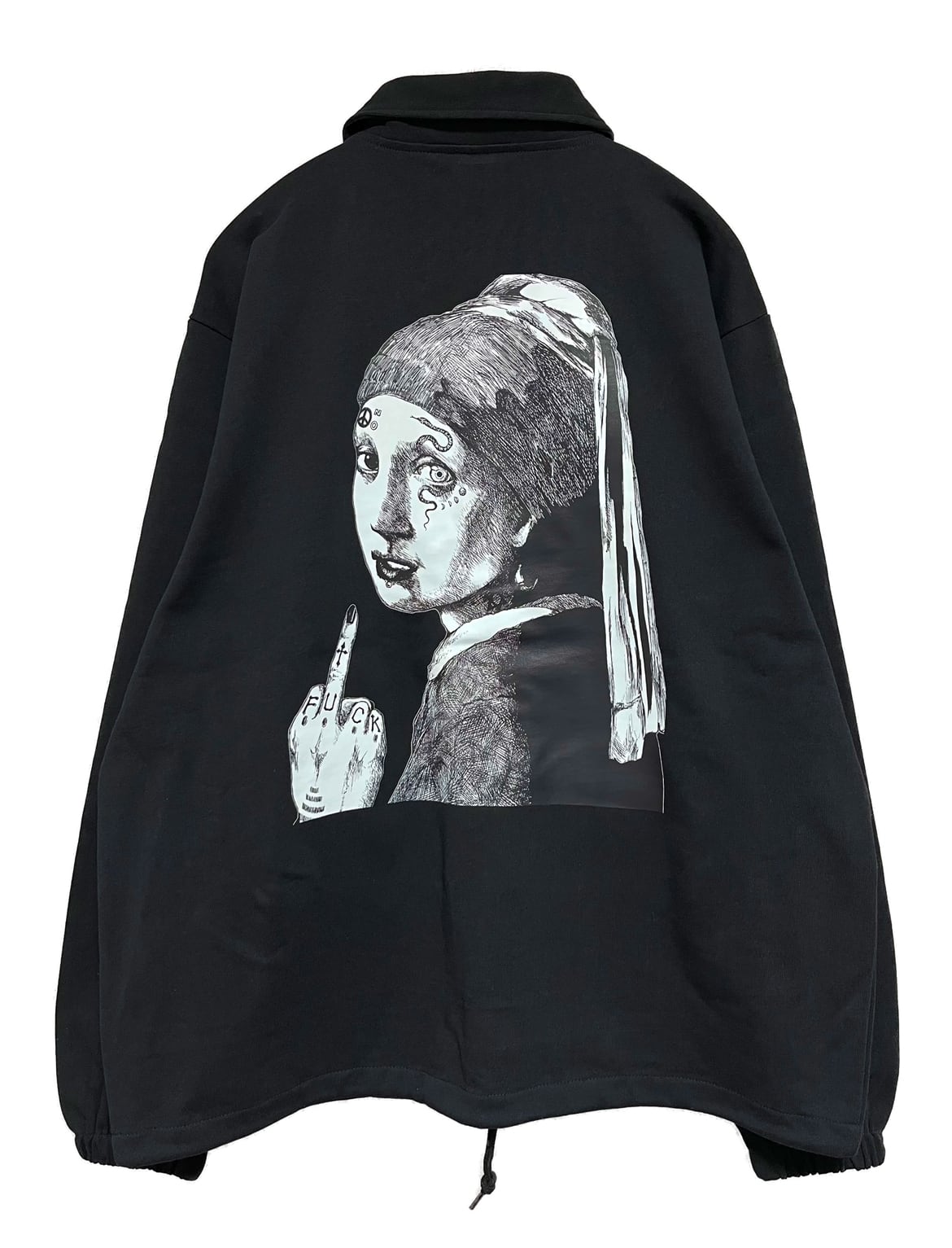 バックにイラストを精緻に再現した転写プリントを施したコットン100%のコーチジャケット。