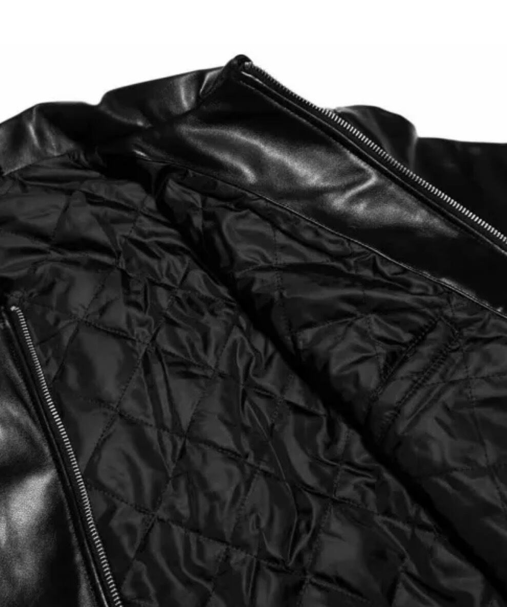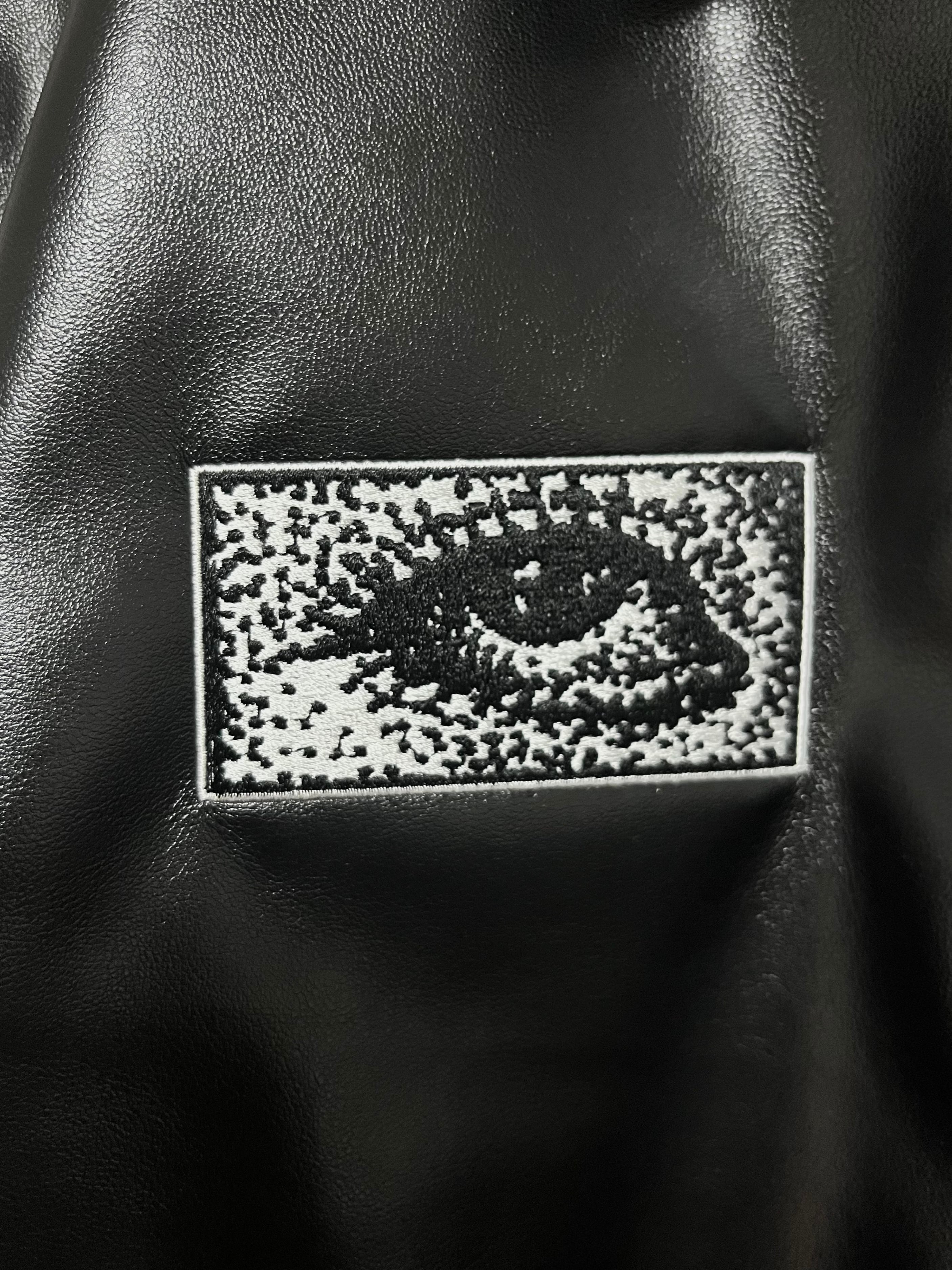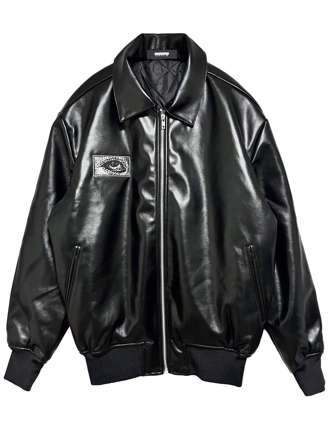 胸元にワンポイント刺繍を施した合成皮革素材のバーシティジャケット。