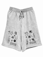 両脚フロントに風合いのあるシルクスクリーンプリントを施した厚手スウェット生地の膝下丈バギーショートパンツ。