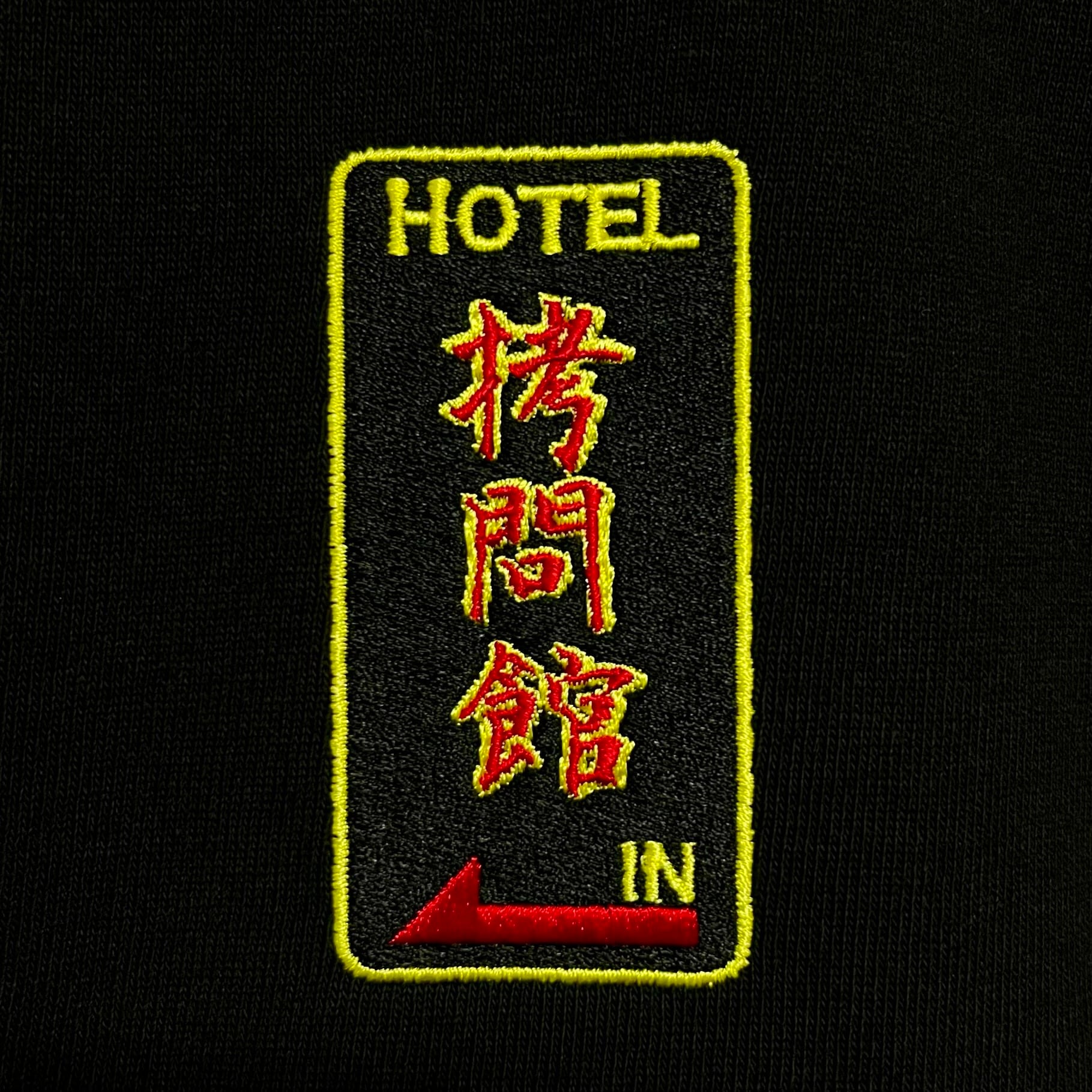 胸元に架空ラブホテルの看板の機械刺繍を施したヘビーウェイトオーバーサイズTシャツ。