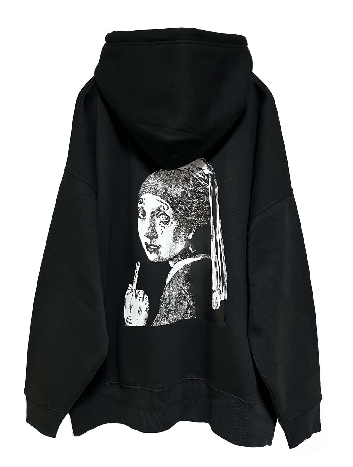 前面胸部と背面にデジタル転写プリントを施したプルオーバーパーカー。