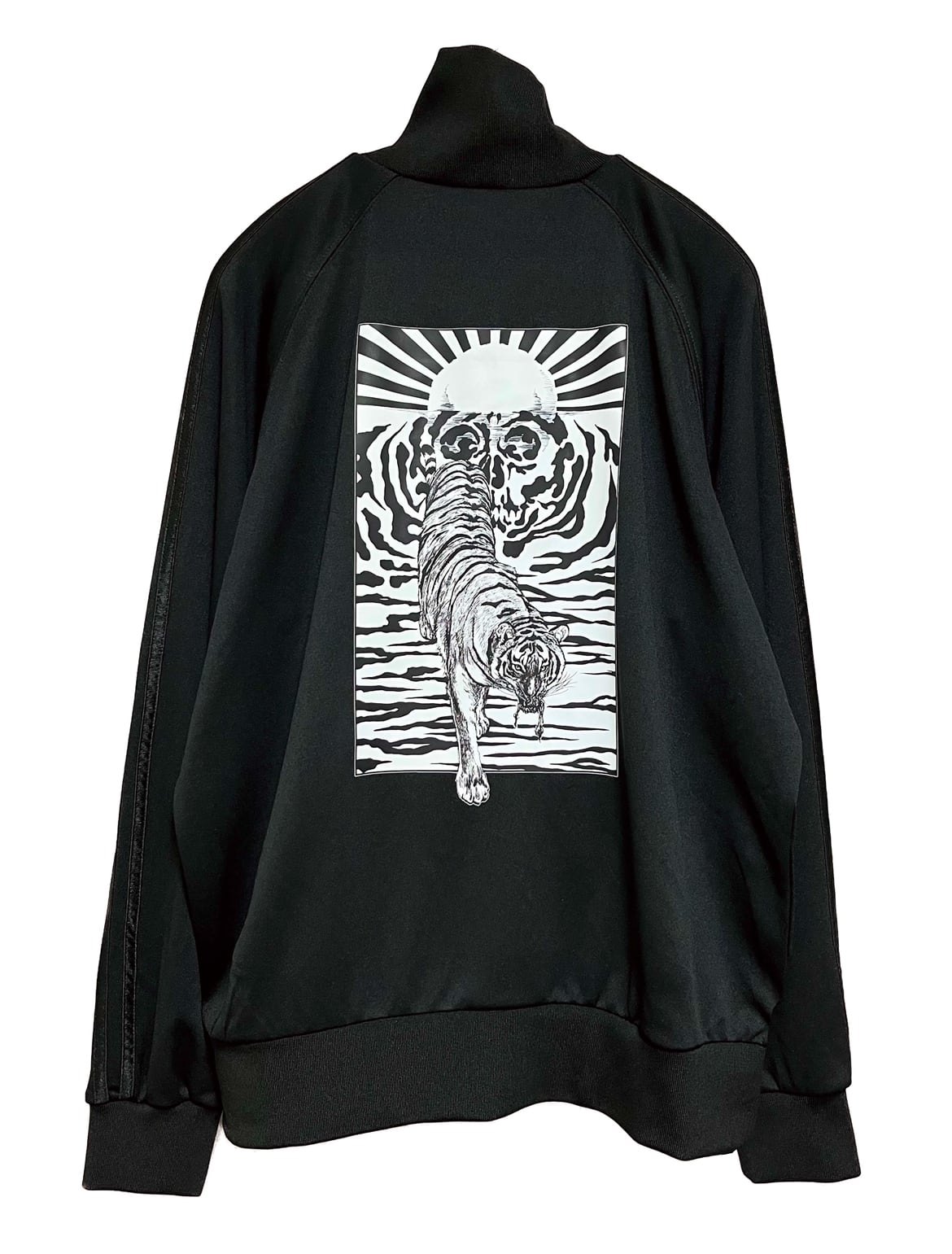 背面にイラストを精緻に再現した転写プリントを施したトラックジャケット。